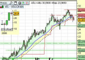 Las posiciones que abrió la semana pasada fueron las de Ferrovial por apoyo ideal. Veremos si aguanta. Para Inditex podríamos tener señal, pero hay que esperar al cierre para plantear la posición para el lunes. Se sigue sí o sí, aunque nos parezca buena o no. (si es que vamos a seguir el sistema al 100%). El resto de posiciones abiertas no las cerrará hasta que no pierdan el momento alcistao salten el stop de beneficio, el cual está representado por una línea roja (en Viscofán no saltan porque son actualizaciones en caso de haber abierto posiciones en las nuevas fugas).