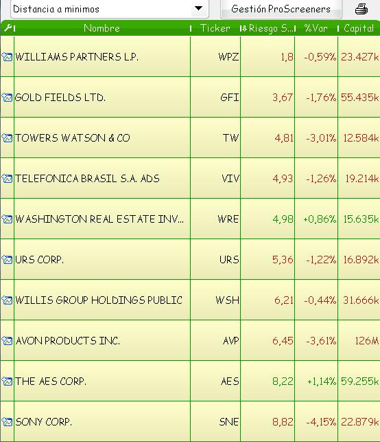El criterio de ordenación fue por Riesgo Stop y obtuvimos los siguientes resultados en el NYSE: Williams Partners, Gold Fields, Towers Watson, Telefinica Brasil, Washington RE, URS Corp, Willis Grp, Avon Products, The AES Corp, y Sony Corp.