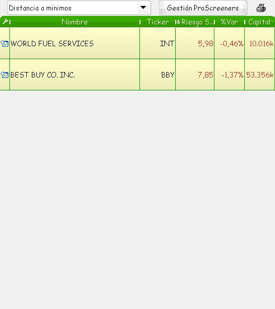 El criterio de ordenación fue por Riesgo Stop y obtuvimos los siguientes resultados en el NYSE: World Fuel Svs y Best Buy Co.