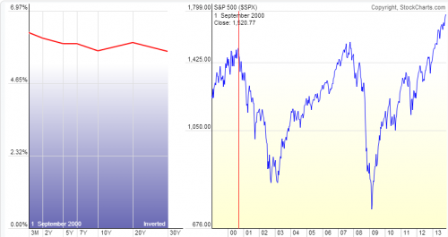 He aquí dos ejemplos de cómo la curva de rendimientos se invierte y lo que ocurre antes y después de los crashes de 2000 y 2007: