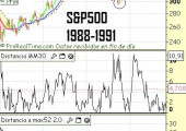 Otro ejemplo es el de 1990. El proceso bajista se detiene cuando la distancia con respecto al máximo anual es superior al 15%. Históricamente se observa que si la distancia con respecto a la MM30 es mayor del 15%, se generan los climax bajistas y fin de tendencia bajista (pero para eso tiene que haber tendencia bajista).