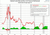 Pues bien, las montañitas verdes es el resultado de dividir la rentabilidad del bono a 10 años frente a la de 2 años. Es decir, si por ejemplo el bono a 10 años ofrece un 2% y el bono a 2 años ofrece el 0,5%, la relación entre ambos será de +4,00. Esto que parece lógico que sea así, en ocasiones no lo es. Se puede llegar a ver rentabilidades mayores por el dinero de más corto plazo. Esto normalmente anticipa algo malo y es precisamente cuando el cociente de estas dos rentabilidades se vuelve menor a +1,00, es decir, la rentabilidad de corto plazo supera a la de largo plazo. Como vemos en el gráfico, siempre que esto ha sucedido, la bolsa ha sufrido recortes, los más evidentes los dos más recientes (2001 y 2008).