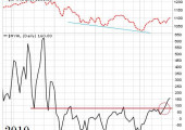 Aquí están los dos argumentos por los que aún no me decido por los cortos en acciones. El sistema nos marca señal de cortos en la semana pasada (marcado por círculo rojo). La mm30 pasa por 1.111,70 y la mm30 ponderada por volumen en 1.117 puntos. El stop que hemos empleado en esta posición está en 1.151, una distancia más que de sobra para saber si esto es una trampa o un inicio de tendencia bajista. Los nuevos máximos son superiores a los anteriores niveles en el NYSE y esto no marca una tendencia bajista clara. Lo ideal sería ver más valores haciendo nuevos mínimos, pero esto sorprendentemente no es así, es más, son bastantes las acciones que están superando sus máximos de 52 semanas, algo muy curioso.