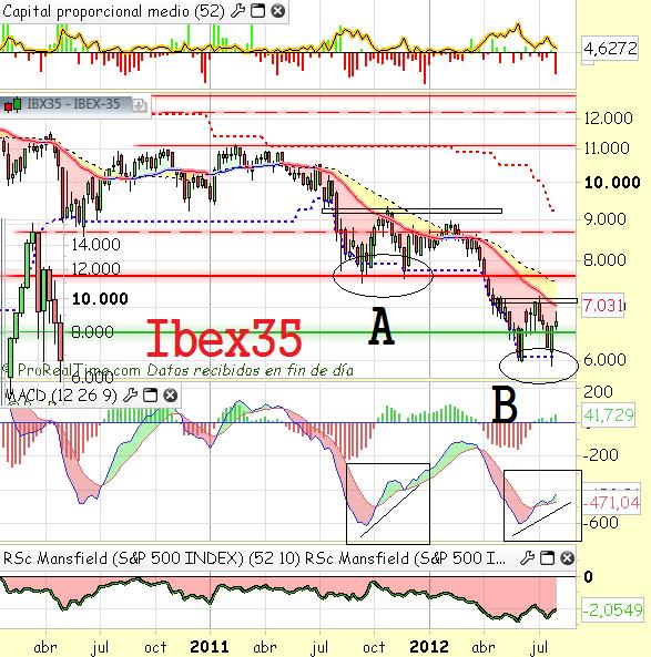 Esta mañana me han preguntado sobre si había una divergencia y es verdad, el Ibex y el MACD divergen positivamente pero ojo! es una divergencia débil, es decir, que el índice Ibex no hizo un nuevo mínimo que no fue seguido por el MACD. Este mínimo quedó a la misma o casi a la misma altura por lo que la zona B se parece mucho a la zona A, en la que la divergencia fue débil y por tanto no fue capaz de hacer girar al Ibex en el medio plazo.