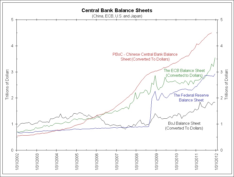 A efectos comparativos, hemos convertido  ocho hojas de balances bancarios en términos de dólares. Las cuatro mayores: el PBoC (banco de China), la Reserva Federal, el BoJ (banco de Japón) y el BCE se muestran en el primer gráfico. Se ve cómo el mayor impresor de dinero actualmente es China, nada de extrañar por tanto las quejas de EE.UU. que vé cómo hay algún banco que incluso le supera en emisión de dinero.
