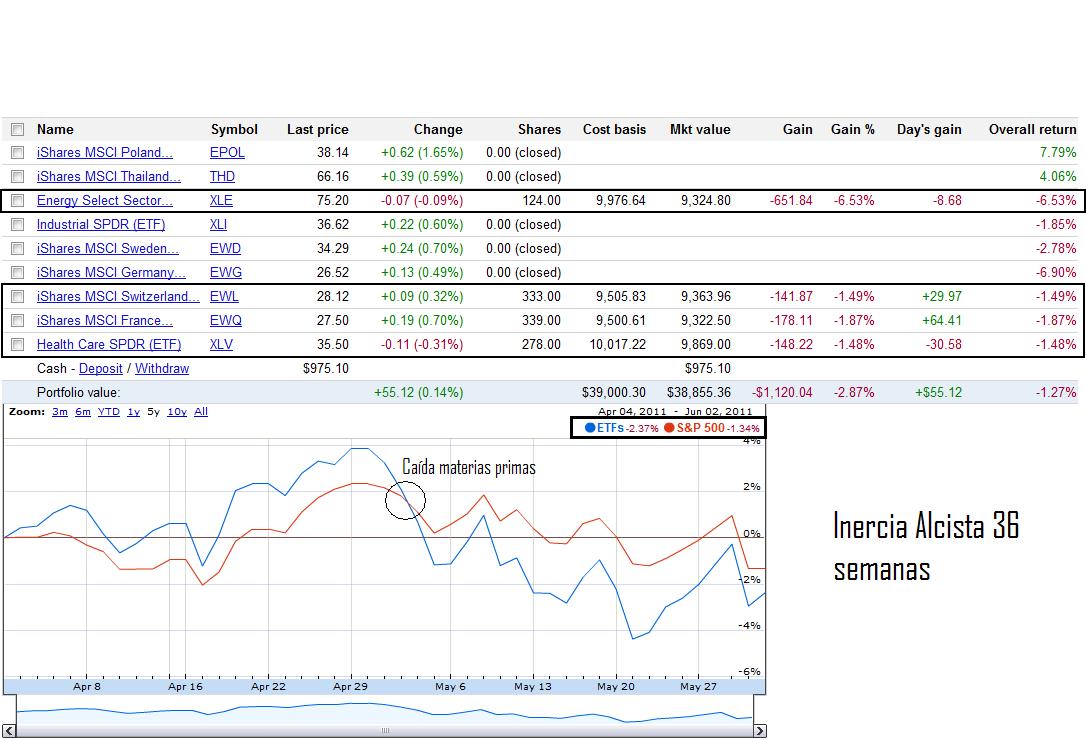 Siguiendo el calendario, vamos a cerrar la posición de Suiza y abriremos España (EWP) y Francia la mantendremos (siguiendo los índices más fuertes en 26 semanas). En el caso de sectores seguirán el de Salud y Energía en cartera. Recuerdo que este estudio se inicio en Abril de 2011 y pretende conocer si la estrategia de comprar lo que más haya subido en 26 semanas tiene sentido mientras el mercado global sea alcista, como es lógico. Actualmente la rentabilidad obtenida contando comisiones es del -1,52% contra un S&P500 que ha subido un +0,52%.
