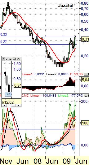 La ampliación de capital dará mayor viabilidad a la compañía, pero en el corto plazo debería ser una noticia negativa que puede perjudicar a su cotización y por ello la mano fuerte antes de preguntar liquida. El volumen aunque no s emuestra, ha sido elevado, dando sostén a las alzas de medio plazo. Por tanto, yo liquidaría los derechos el primer día y compraría Jazzteles a 0,25. La última vez os dije que el objetivo de la taza era 0,22 y se quedó en 0,23. Ahora os digo que antes de continuar, podría descender al 0,25 de nuevo. Si por el contrario sigue ascendiendo, los 0,35 puede ser otra buena zona de acumulación.