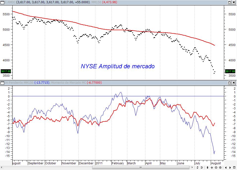 Ya estoy con las primeras pruebas en Metastock de la amplitud de mercado. Vamos a poner de forma periódica el gráfico con: la MM150 (equivalente a la MM30 en semanal) de la línea A/D, el momento de mercado (según Stan Weinstein) y adjunta, una línea que medirá la pendiente de la MM150 (línea azul fina). De esta manera tendremos una visión más fiel de lo que está ocurriendo en los gráficos. Recuerdo que la diferencia en emplear un gráfico de amplitud de mercado y un normal radica principalmente en la ponderación del mismo.