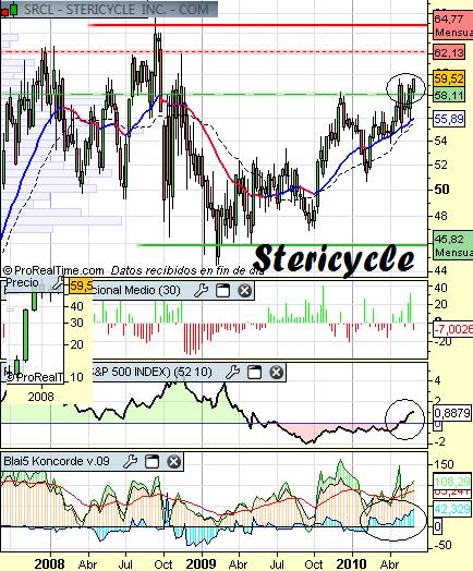 Del sector Industrial Goods -> Waste Management, ha sufrido poco la caída y aunque tampoco ha recuperado demasiado en las alzas, se mantiene imperturbable en su subida lenta pero segura. Es uno de los que me gustan y ojo porque su subida libre está cercana, una vez pase 62,20 (no es su máximo absoluto pero es un nivel de fuga clave).