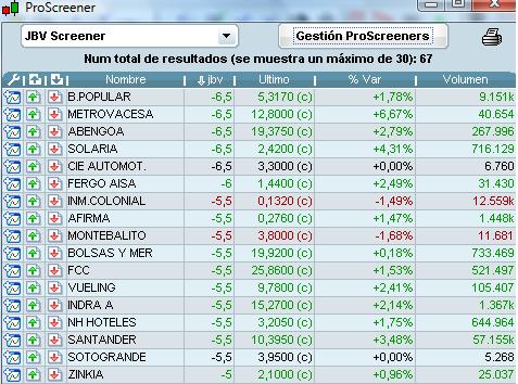 Es de destacar que no hay ningún valor por debajo de -7,00 en el mercado contínuo. Esto muestra una mejoría evidente en los aspectos técnicos. Los peores valores salen para B.Popular, Metrovacesa, Abengoa, Solaria y CIE, todos ellos con -6,50 puntos en la escala JBV que va de -10 a +10.