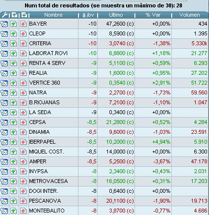 Aunque lo suyo es sacar estos análisis el fin de semana, ya que las lecturas de volumen son con la semana completa, os saco lo que a día de hoy está peor, aunque puede variar a fin de semana. Siguen algunos clásicos como Natra, Sinamia, Dogi o La Seda. Otros han empeorado notablmente como Criteria ó Pescanova. Ya no salen tantos bancos como salían antes ni casi ningún integrante del Ibex, esto puede ser positivo para las próximas semanas.