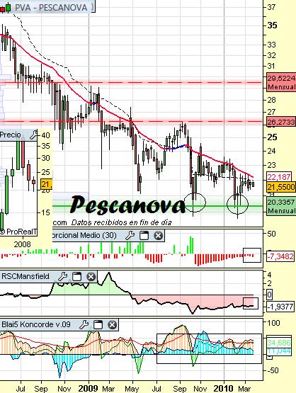 Pescanova: Tiene que pasar el nivel de 23,00 y apoyar en la mm30. El volumen podría comenzar a ascender, pero aún es demasiado ligero para hacer una base de despegue. El valor está peor que el mercado aunque como he mencionado antes, la entrada de mano fuerte es evidente.