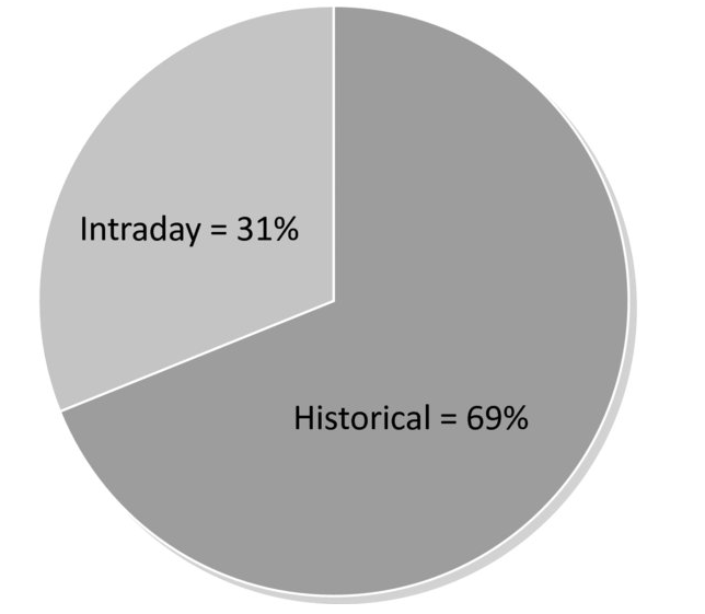 2) Si nos hacemos la pregunta sobre el número de participantes que son daytraders y que por tanto miran el gráfico intradiario y lo comparamos con aquellos que miran gráficos históricos, la preferencia es clara. Observe cómo el gráfico histórico se carga en la plataforma de los traders más del doble que el intradiario. Realmente no es sorprendente ya que la operativa intradía requiere una formación exhaustiva y no muchos sobreviven.
