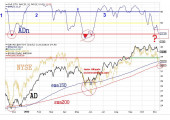 El Summation (línea roja) marcó divergencia justamente en el punto alto de hace unas semanas. Estaba claro que el mercado cada vez tenía menos apoyos por parte de sus componentes y por dentro eso se notaba en el Summation. Es lo bueno de saber determinar la salud por dentro del mercado y no quedarnos sólo con la fachada (el índice NYSE). Ahora otorga poca información salvo que confirma las futuras divergencias bajistas al término del Impulso 3 y 4 y el final del patrón alcista.