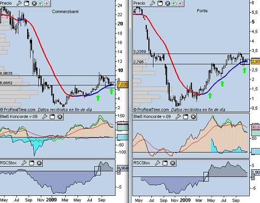 La caída en todos estos valores ha sido increible, y aunque la recuperación tarde, se hará en forma de apoyo en mm30 y nuevo tramo al alza. Si el sectorial apoya, es muy probable que comerzbank y fortis vayan a zonas de máximos. En ambos valores no se ve una mano fuerte predominante por lo que yo las recomendaría más para operaciones de más corto plazo. Hay mejores bancos sí, pero es interesante aprovechar movimientos rápindos en otros valores no tan atractivos a priori en el medio plazo.