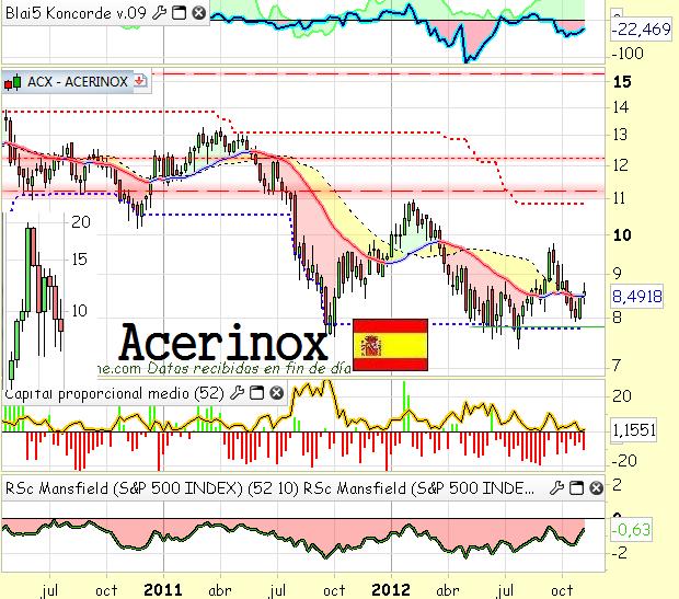 Aunque pueda parecernos que ahora en estos días que el mercado ha caído precisamente Arcelor Mittal o Acerinox se hayan librado son más débiles que el conjunto del mercado (-1,03 y -0,63 respectivamente). Algún día dejarán de ser bajistas y se podrá comprar pero creo que ese momento no ha llegado aún. seguiría fuera mientras tanto.