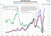 ¿Cuál sería el valor del S & P 500 si nos ajustamos a la subida o bajada del dólar? Por lo general hay que tener en cuenta el ajuste por inflación (que está en la moneda intrinsecamente), el impacto de las medidas de los bancos centrales, el gasto gubernamental, la política monetaria… Para dar respuesta, vamos a utilizar gráficos desde marzo de 1973 en base de 100 para el dólar y ajuste del índice de precios S & P por un movimiento relativo en el índice del dólar.