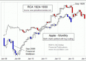 Después de su caída en la crisis de 1929, RCA tuvo una fuerte recuperación de varios meses en 1930. Ese rebote finalmente se dio la vuelta, llegando a precios de RCA a niveles mucho más bajos durante la década de 1930, pero el rebote temprano en 1930 fue impresionante. Dada la semejanza de Apple y el patrón de precios de RCA hasta el momento, no sería demasiado sorprendente ver un rebote similar en Apple en los próximos meses, teniendo en cuenta especialmente cómo los inversores parecen estar cambiando últimamente de parecer acerca de las acciones de Apple.