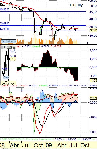 Su aspecto es similar a nuestra Grifols y aunque nos tienten sus abundantes dividendos, la acción está cotizando algo que desconocemos y por esto no sube.. Mientras no pase los 36,00 yo no compraba nada de nada.. y aun así, compraría el 50% de una posición inversora normal. Mientras los dos anteriores valores: CocaCola y ColgatePalmolive nos gustaban mucho por su aspecto y sis bondades dividendisticas, hay que decir que Eli Lilly de momento es un no tocar.